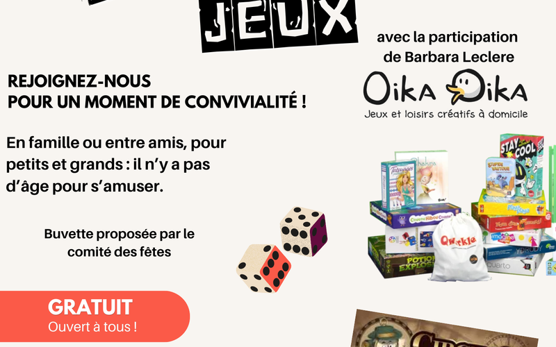 Petits et grands, entre amis ou en famille, venez partager un temps de jeu tous ensemble ! De nombreux jeux seront proposés par Barbara LECLERE qui représente la société Oika Oika;