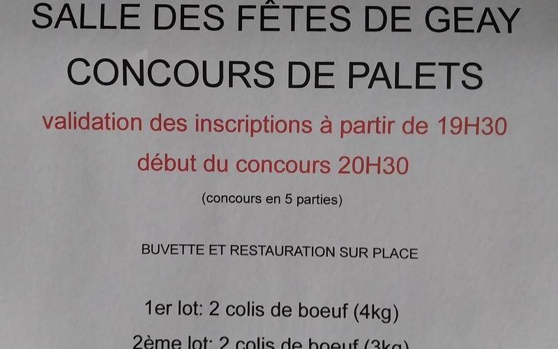 concours de petits palets a la salle des fêtes de Geay, organisé par le comité des fêtes Bou'Geay 18€ la doublette, buvette et restauration sur place 1 lot pour chaque participants + tombola