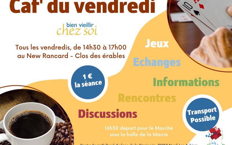 Vous êtes à la retraite, ou vous ne travaillez pas le vendredi et vous chercher un endroit pour jouer aux cartes, aux jeux de société, discuter autour d'un petit goûter... Le Caf' du vendredi est fait pour vous. Rendez-vous tous les vendredis au Centre SocioCulturel de Nueil-Les-Aubiers, de 14h30 à 17h00. Un transport est possible sur demande.