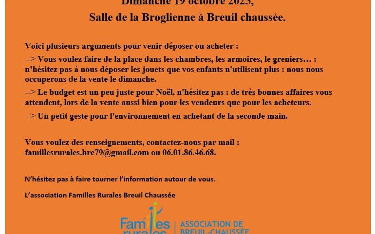 L'association Familles Rurales de Breuil Chaussée organise sa 12eme bourse aux jouets, le dimanche 19 octobre 2025 (10h à 14h30) à la salle polyvalente de BREUIL CHAUSSEE. Vous voulez faire de la place dans les chambres de vos enfants, apportez-nous vos jouets et nous les vendrons.