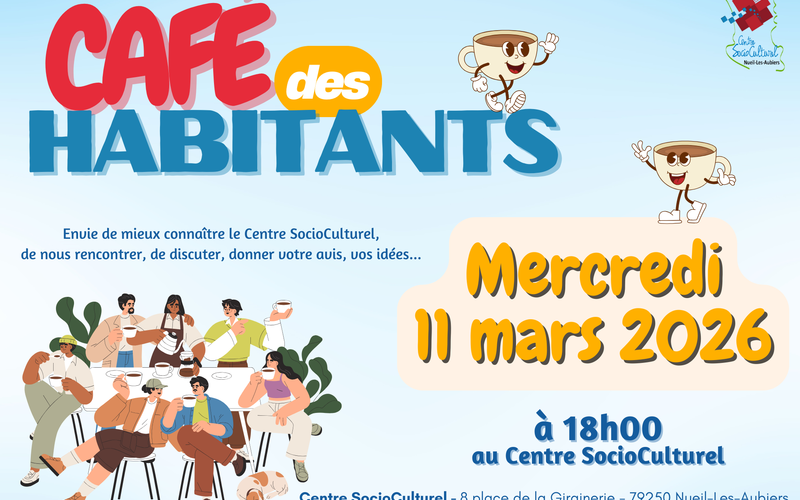 Vous ne connaissez pas bien ou pas du tout le Centre SocioCulturel de Nueil-Les-Aubiers, ou vous connaissez déjà et vous avez envie de nous aider à nous faire connaitre, rejoignez-nous pour un "Café des habitants", le mercredi 11 mars à 18h00, au Centre SocioCulturel, 8 place de la Girainerie à Nueil-Les-Aubiers, l'occasion de découvrir les actions, les valeurs d'un Centre SocioCulturel qui se veux au plus près des demandes des habitants.