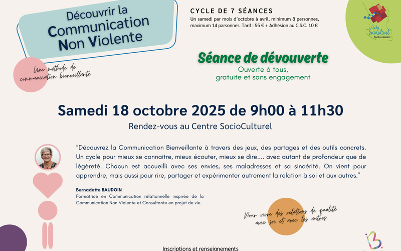 Le Centre SocioCulturel de Nueil-Les-Aubiers, vous propose de décourir la Communication Non Violent. Vous serez guidé par Bernadette BAUDOIN, formatrice en Communication relationnelle inspirée de la Communication Non Violente. Sur un cycle de 7 séances, découvrez la Communication Bienveillante à travers des jeux, des partages et des outils concrets. Un cycle pour mieux se connaitre, mieux écouter, mieux se dire.... avec autant de profondeur que de légèreté. Chacun est accueilli avec ses envies, ses maladresses et sa sincérité. On vient pour apprendre, mais aussi pour rire, partager et expérimenter autrement la relation à soi et aux autres.