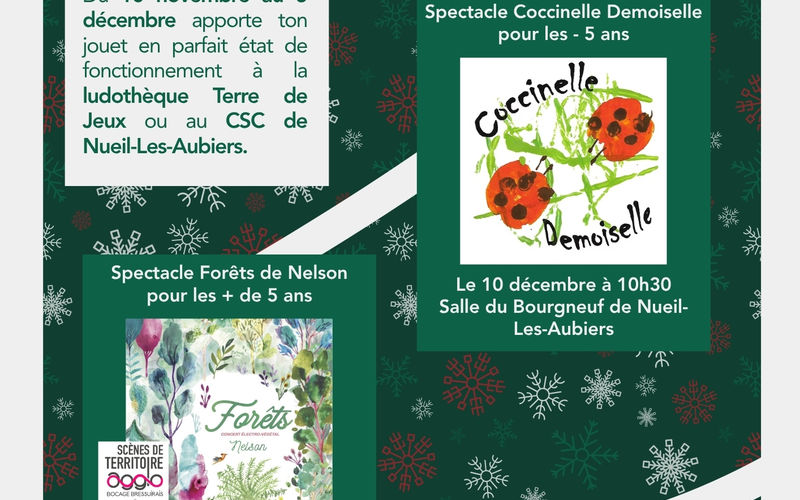 Le premier spectacle proposé, pour les enfants de moins de 5 ans, "Coccinelle Demoiselle", aura lieu le mercredi 10 décembre à 10h30 à la salle du Bourgneuf. Une place de spectacle en échange d'un jouet ou un jeu, à déposer au Centre SocioCulturel ou à la Ludothèque.