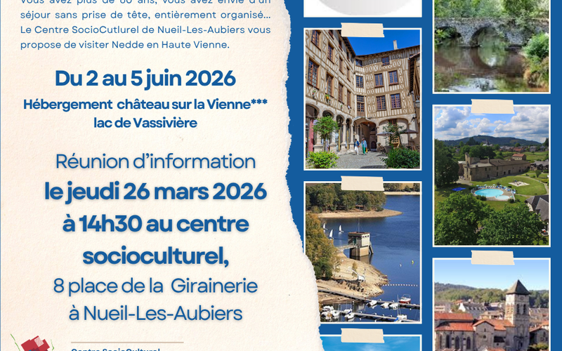 Comme chaque année, le Centre SocioCulturel de Nueil-Les-Aubiers organise un séjour séniors, cette année, destination Nedde en Haute Vienne, avec un hébergement au Château sur la Vienne, Lac de Vassivière du 2 au 5 juin.