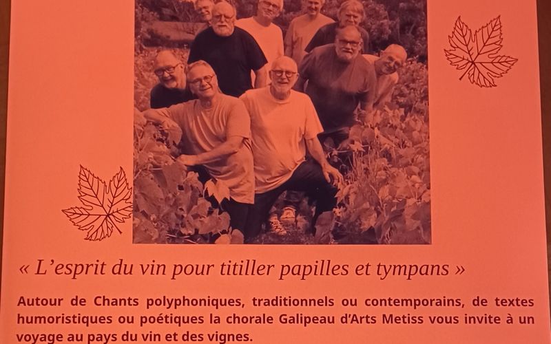 Autour de chants polyphoniques, traditionnels ou contemporains, de textes humoristiques ou poétiques, la chorale Galipeau d'Arts Metiss, vous invite à un voyage au pays du vin et des vignes.