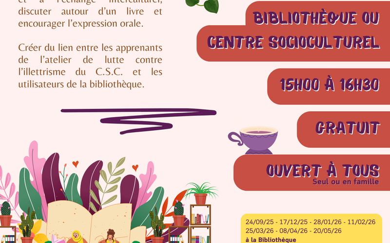 Pour faciliter l’accès à la bibliothèque et à l’échange interculturel, discuter autour d’un livre et encourager l’expression orale. Créer du lien entre les apprenants de l’atelier de lutte contre l’illettrisme du C.S.C. et les utilisateurs de la bibliothèque. Ces rencontres gratuites, sont ouvertes à tous, seul ou en famille.