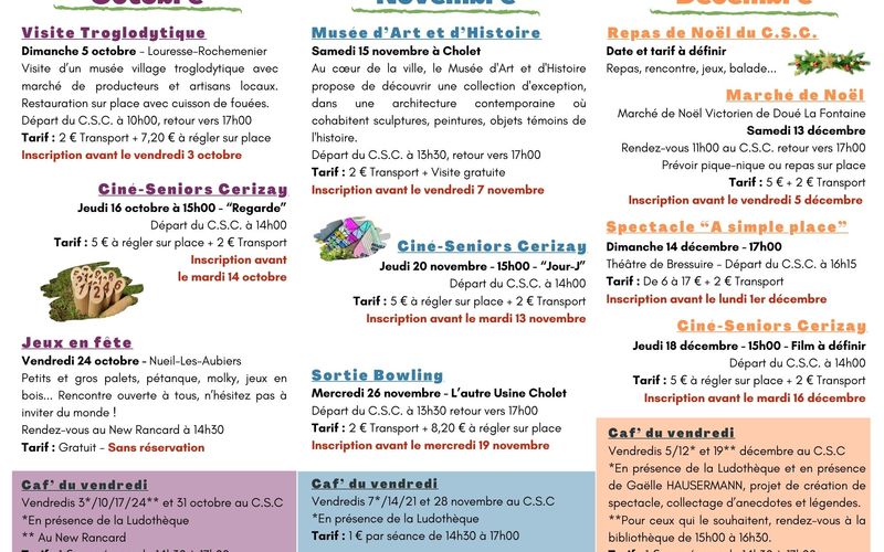 Adhésion au C.S.C. obligatoire (10 € par foyer pour la saison 2025 2026). Tarifs : 5 € + 2 € de transport. Inscription avant le 05/12 auprès de l'accueil du C.S.C. au 05.49.65.42.10 ou accueil@cscnla.fr