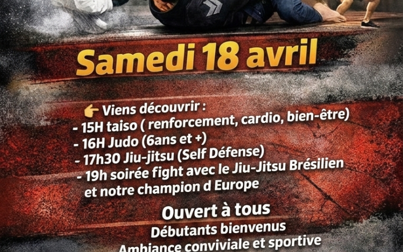 Venez tester ou découvrir les disciplines du Judo Club du Bocage Bressuirais. Taiso, jiu-jitsu, self-défense, judo et jiu-jitsu brésilien seront au programme de cette après-midi sportive. Goûter offert à tous les jeunes qui testeront le judo. Les débutants sont les bienvenus. Ambiance conviviale et sportive, suivi d'une soirée dansante.