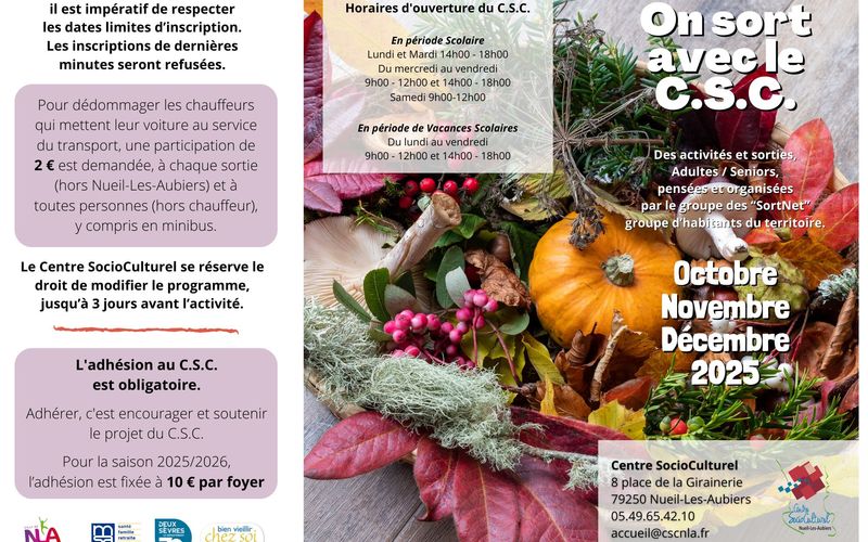 Adhésion au C.S.C. obligatoire (10 € par foyer pour la saison 2025 2026). Tarifs : 7 € + 2 € de transport. Inscription avant le 07/11 auprès de l'accueil du C.S.C. au 05.49.65.42.10 ou accueil@cscnla.fr