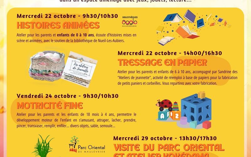 Comme l'an passé, nous vous proposons des ateliers divers et variés, nous avons travailler avec les acteurs locaux pour vous proposer une formule encore plus complète !(atelier lecture, parcours de motricité, atelier expression scénique, atelier chant, atelier loisirs créatifs, maquillage, boum...)