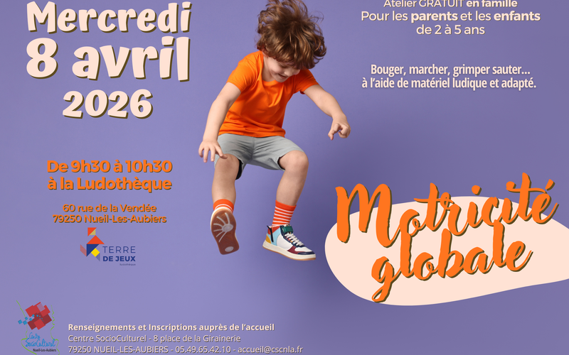 Le secteur famille du Centre SocioCulturel de Nueil-Les-Aubiers, propose, pendant les vacances de Printemps, plusieurs animations gratuites pour les adhérents au C.S.C. (10 € par foyer pour la saison 2025/2026). Quel que soit la tranche d'âge demandée pour l'animation, toute la famille est invitée, une animatrice sera présente pour les autres enfants. Rendez-vous le mercredi 8 avril de 9h30 à 10h30 à la Ludothèque pour "bouger, sauter, grimper..." pour les enfants de 2 à 5 ans. Inscription obligatoire auprès de l'accueil du C.S.C. au 05.49.65.42.10 ou accueil@cscnla.fr