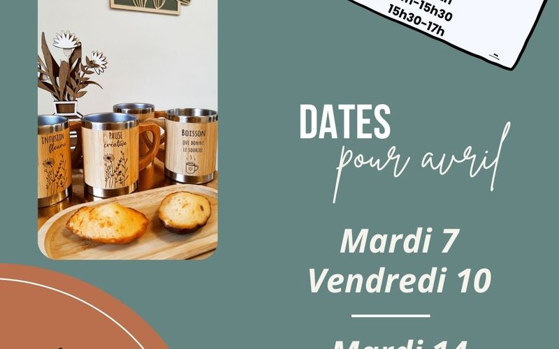 Venez passer du temps à l'Atelier d' Elcy autour d'une boisson ou d'une collation, tout en faisant une activité créative en bois. L' Atelier d' Elcy vous propose des cafés créatifs, avec trois créneaux par date, de 10 h à 12 h, de 14 h à 15 h 30 et de 15 h 30 à 17 h.
