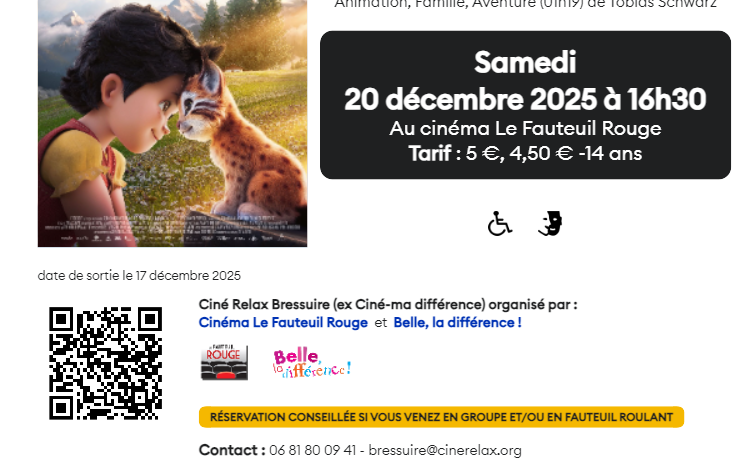 Ciné-relax Votre séance ciné-relax est à 16h30 précises car il n’y a pas de pub à cette séance. Le son est moins fort et l’extinction des lumières est dégressive. Des bénévoles sont là pour accompagner les familles et les établissements handicap. Salle 2 au cinéma le Fauteuil ROUGE à Bressuire. 5 € la place et 4,50 € pour les -14 ans Parking dépose-minute pour les véhicules handicap devant le hall du cinéma. FILM: HEIDI ET LE LYNX DES MONTAGNES Renseignements : https://www.facebook.com/belleladifference/ Ou au 06 81 80 09 41 Site de ciné-relax Bressuire : https://culture-relax.org/search?query=bressuire