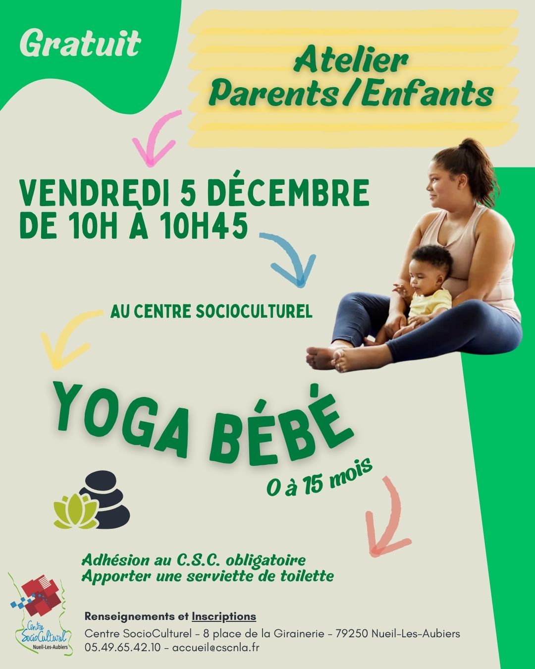 Envie de partager un moment privilégié avec votre enfant, de partager un temps complice et bienveillant avec votre petit bout ? Pour soutenir la parentalité, le Centre SocioCulturel vous propose des ateliers Parents/Enfants, qui vous permettrons de renforcer les liens mais aussi de rencontrer d’autres familles du territoire. Ces ateliers sont adaptés en fonction des âges des enfants. Nous vous proposons un atelier "Yoga bébé" pour les enfants de 0 à 15 mois.