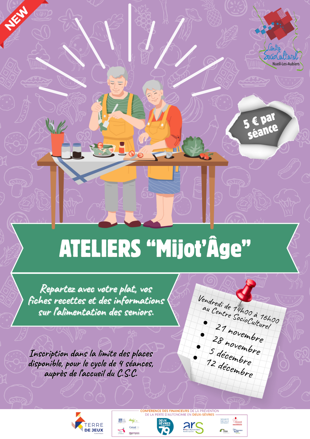 Le Centre SocioCulturel de Nueil-Les-Aubiers propose aux seniors un cycle de 4 séances “Mijot’Age”. Atelier sur l’alimentation, accompagné par une diététicienne. Le principe est de proposer des ateliers le vendredi pour rapporter chez soi un repas équilibré dans le week-end mais aussi pour apporter des informations sur l’équilibre alimentaire des seniors avec des menus à des prix abordables.