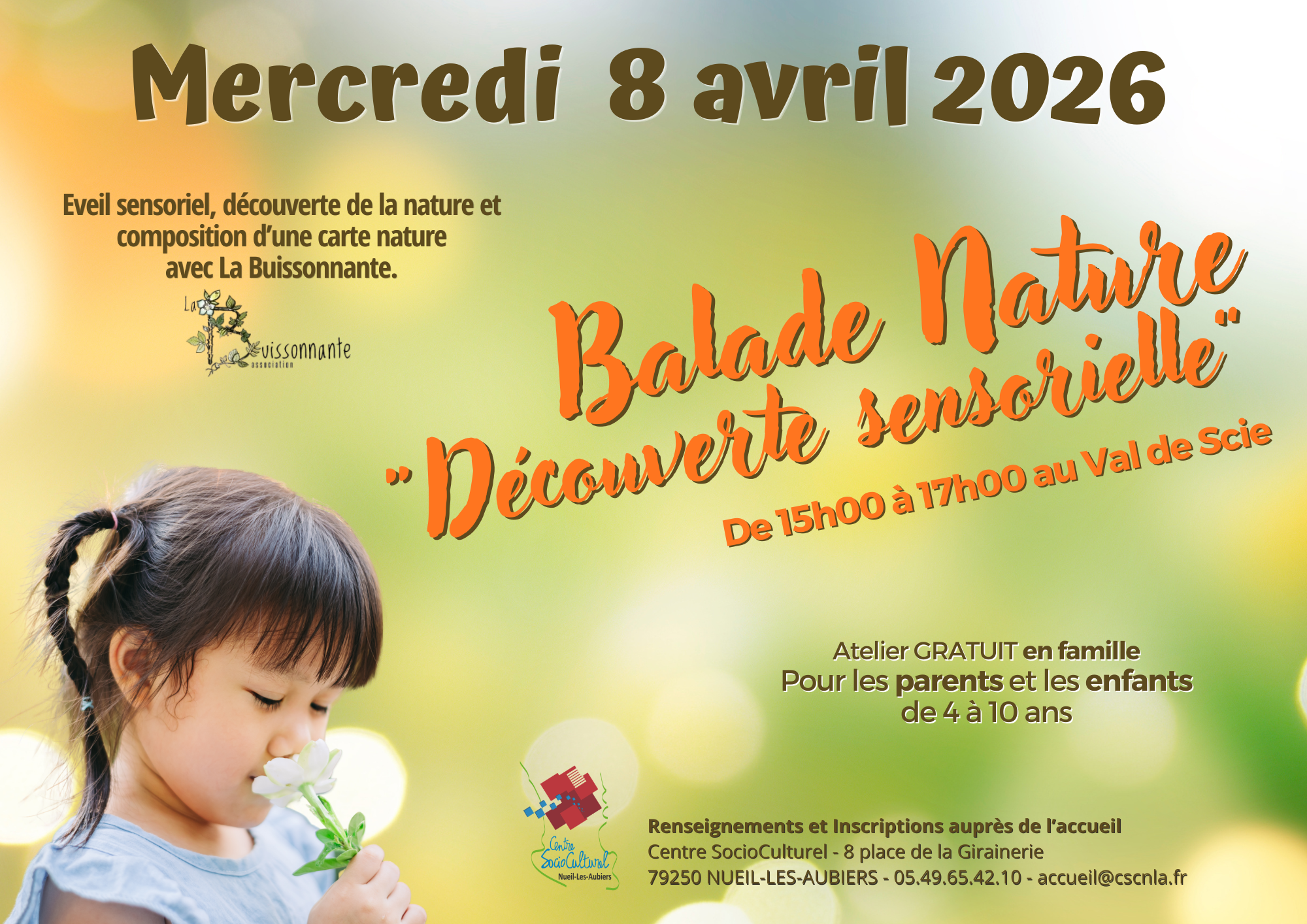 Inscription obligatoire auprès de l'accueil du C.S.C. au 05.49.65.42.10 ou accueil@cscnla.fr