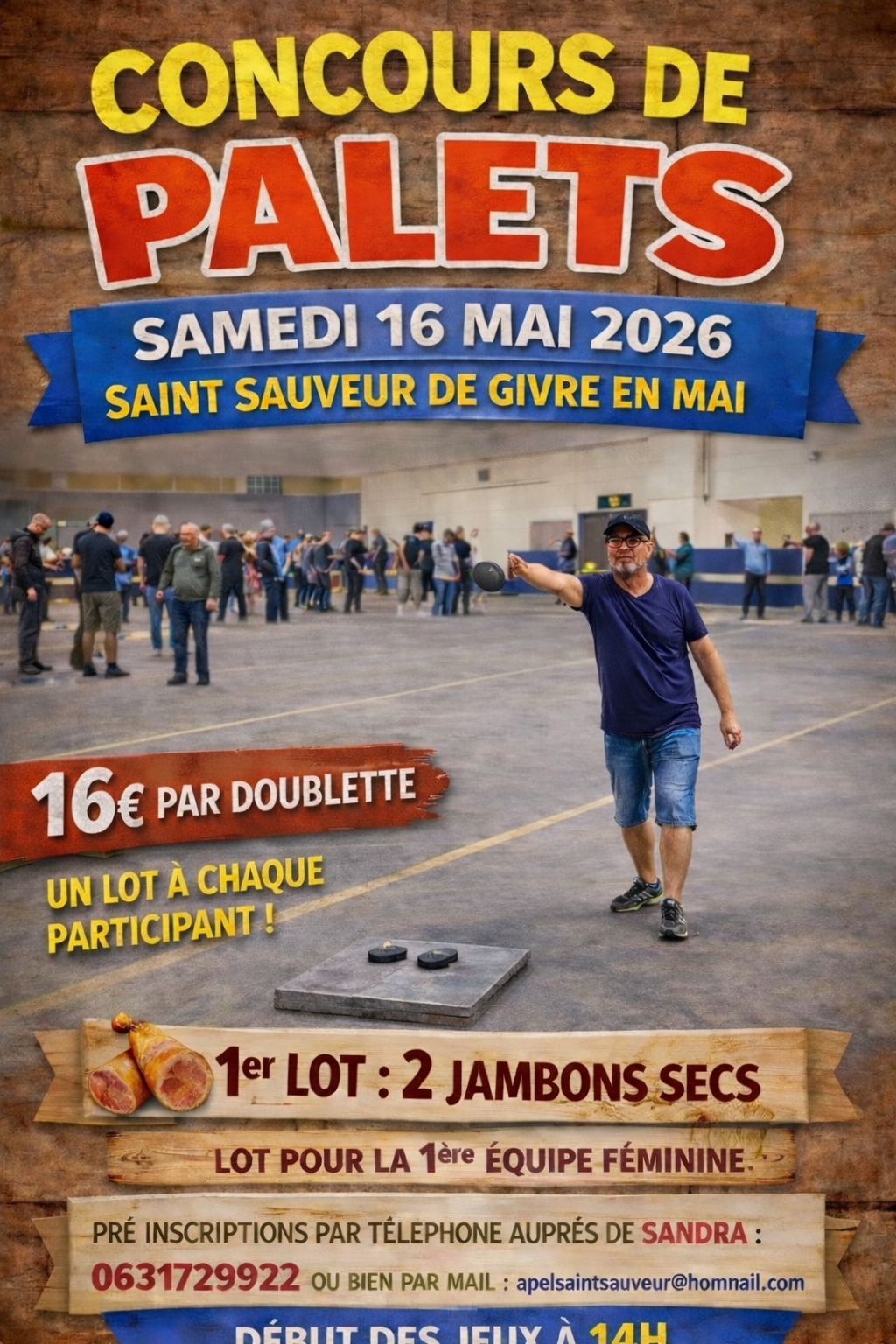 Organisé par l'association des parents d'élèves de l'école de Saint Sauveur. 16€ la doublette. Début des jeux a 14h. Un lot a chaque participant.