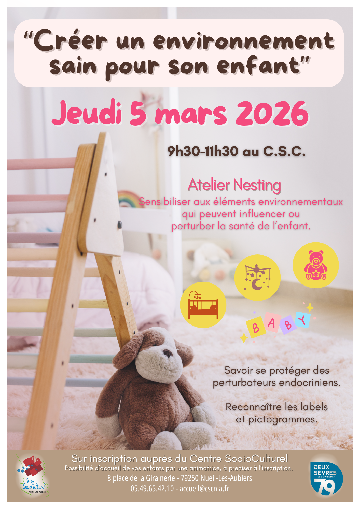 Le Centre SocioCulturel de Nueil-Les-Aubiers propose de nombreuses animations de soutien à la Parentalité. Le jeudi 5 mars de 9h30 à 11h30 au C.S.C. ce sera un atelier Nesting à l'attention des parents pour "Créer un environnement sain pour son enfant", sensibiliser aux éléments environnementtaux qui peuvent influencer ou perturber la santé de l'enfant.
