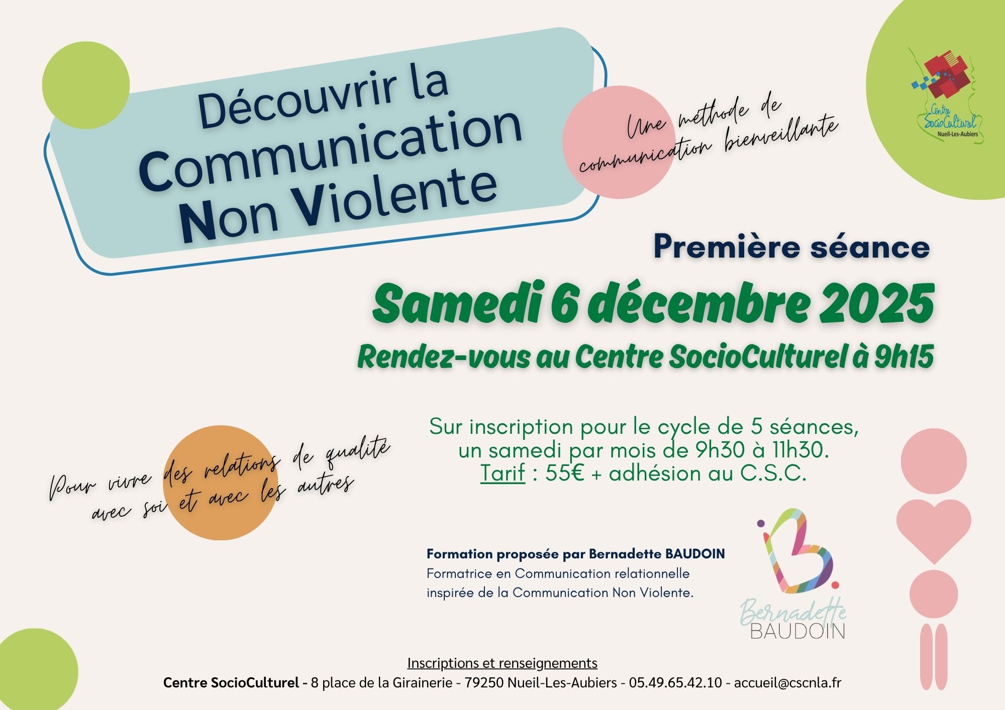 Le Centre Socioculturel de Nueil-Les-Aubiers vous propose de découvrir la Communication Non Violente, une méthode de communication Bienveillante, à travers des jeux, des partages et des outils concrets au cours d’un cycle de 5 séances, un samedi par mois de 9h30 à 11h30.