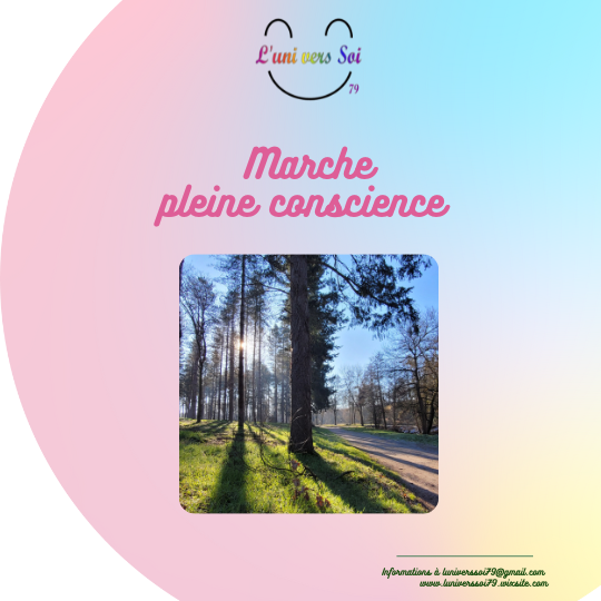 Marche pleine conscience, organisée par l'association L'uni vers soi 79. Prenez un temps pour vous en pleine nature. Venez découvrir la marche pleine conscience, l'écoute de soi et de ce qui vous entoure. Préférez une tenue souple et confortable, adaptée à la météo du jour. Aucun autre matériel n'est nécessaire.
