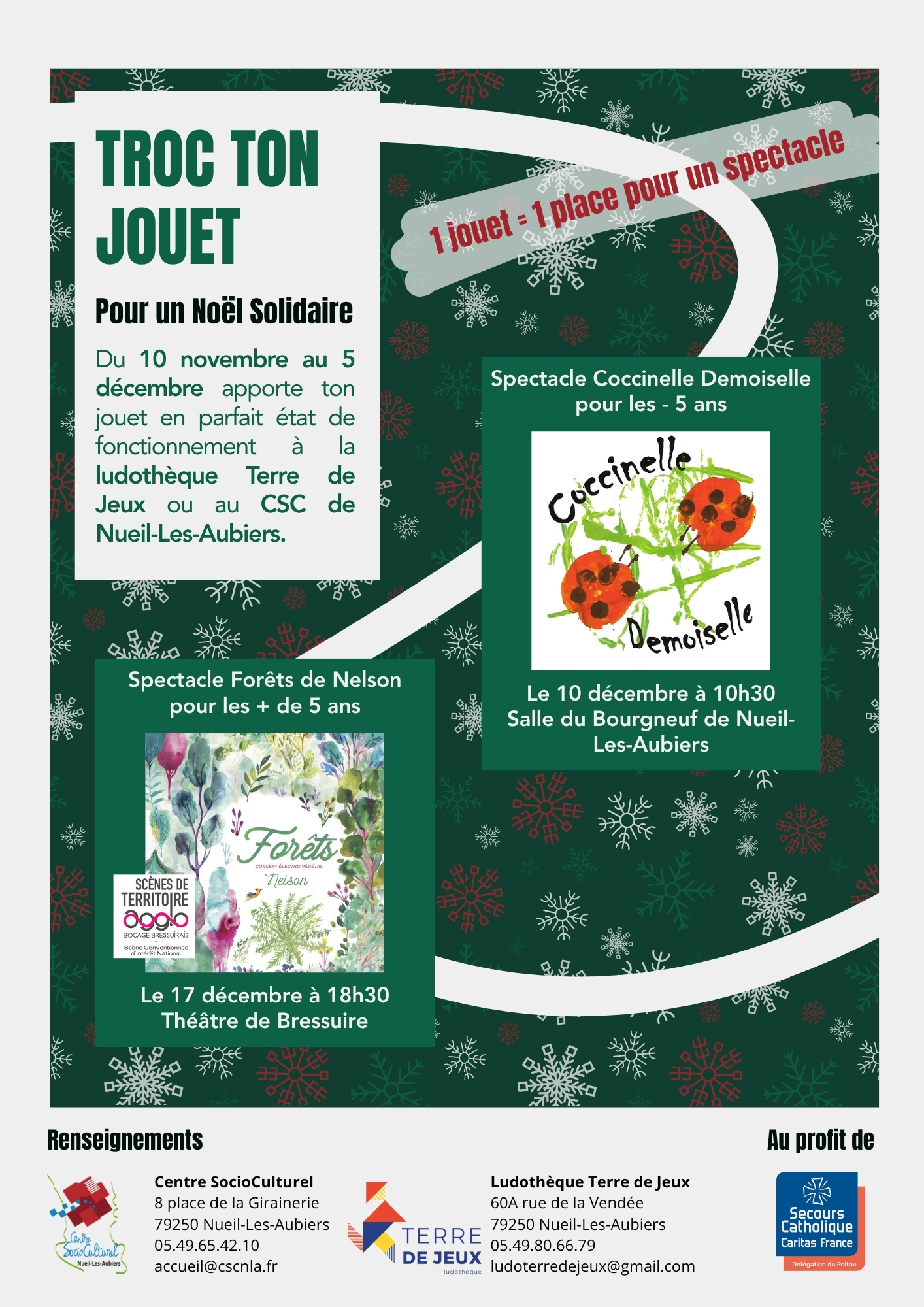 Pour la 3ème année consécutive, le Centre SocioCulturel de Nueil-Les-Aubiers et la Ludothèque Terre de Jeu s'associent pour "Troc ton jouet", une collecte de jeux et jouets, 10 novembre au 5 décembre, en échange de places de spectacle à vivre en famille. Les jeux et jouets seront redistribués par le Secours Catholique.