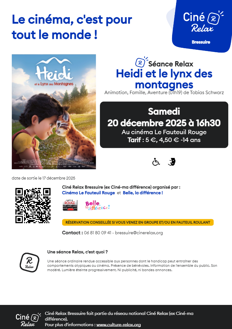 Ciné-relax Votre séance ciné-relax est à 16h30 précises car il n’y a pas de pub à cette séance. Le son est moins fort et l’extinction des lumières est dégressive. Des bénévoles sont là pour accompagner les familles et les établissements handicap. Salle 2 au cinéma le Fauteuil ROUGE à Bressuire. 5 € la place et 4,50 € pour les -14 ans Parking dépose-minute pour les véhicules handicap devant le hall du cinéma. FILM: HEIDI ET LE LYNX DES MONTAGNES Renseignements : https://www.facebook.com/belleladifference/ Ou au 06 81 80 09 41 Site de ciné-relax Bressuire : https://culture-relax.org/search?query=bressuire