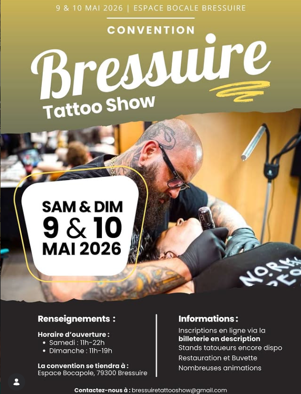 Exposants avec un grand nombre de tatoueurs et d’animations tout au long du week-end, Concours de tatouages, Tombola, Foodtruck, Dj