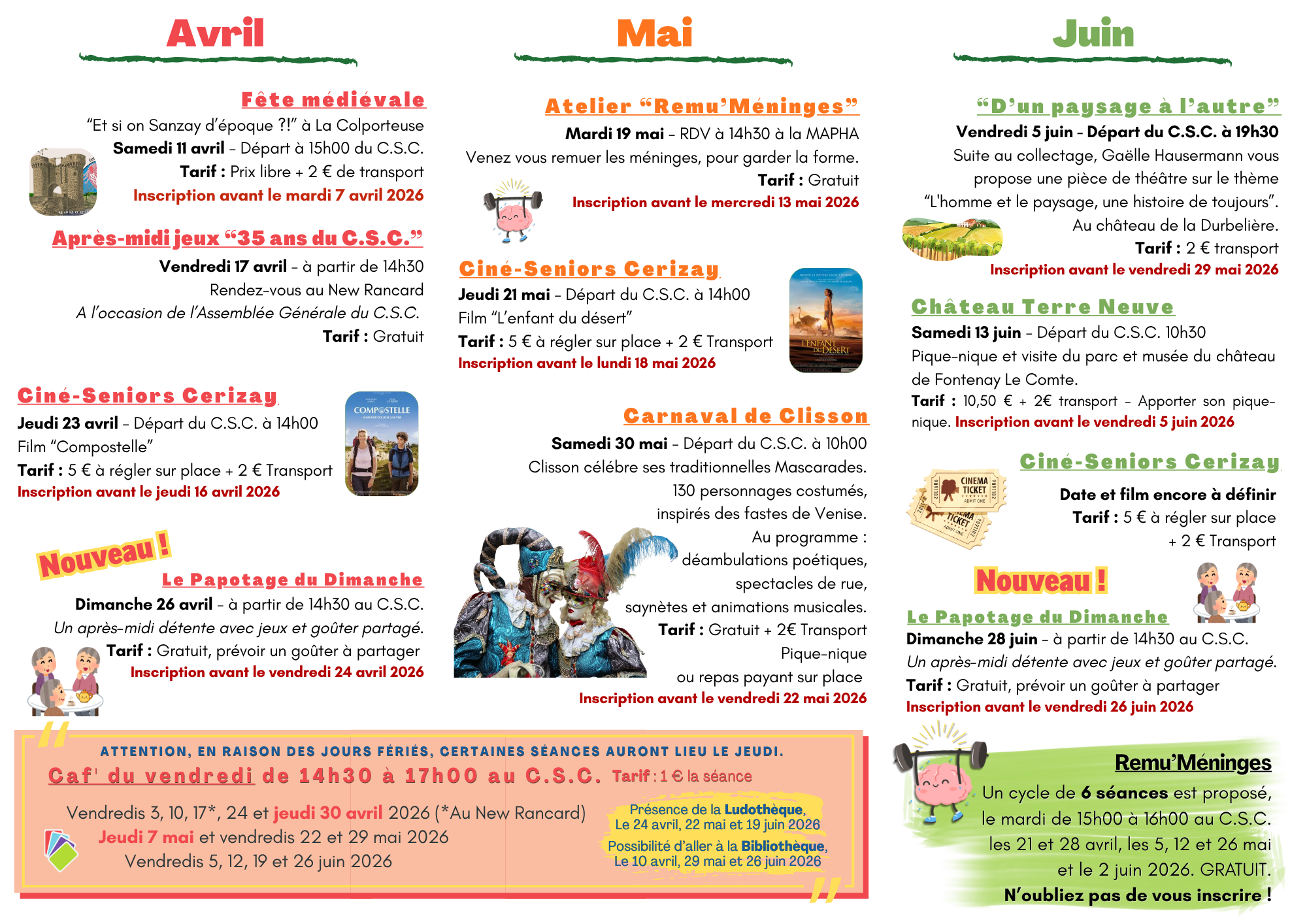 Inscription obligatoire auprès de l'accueil du C.S.C. au 05.49.65.42.10 ou accueil@cscnla.fr