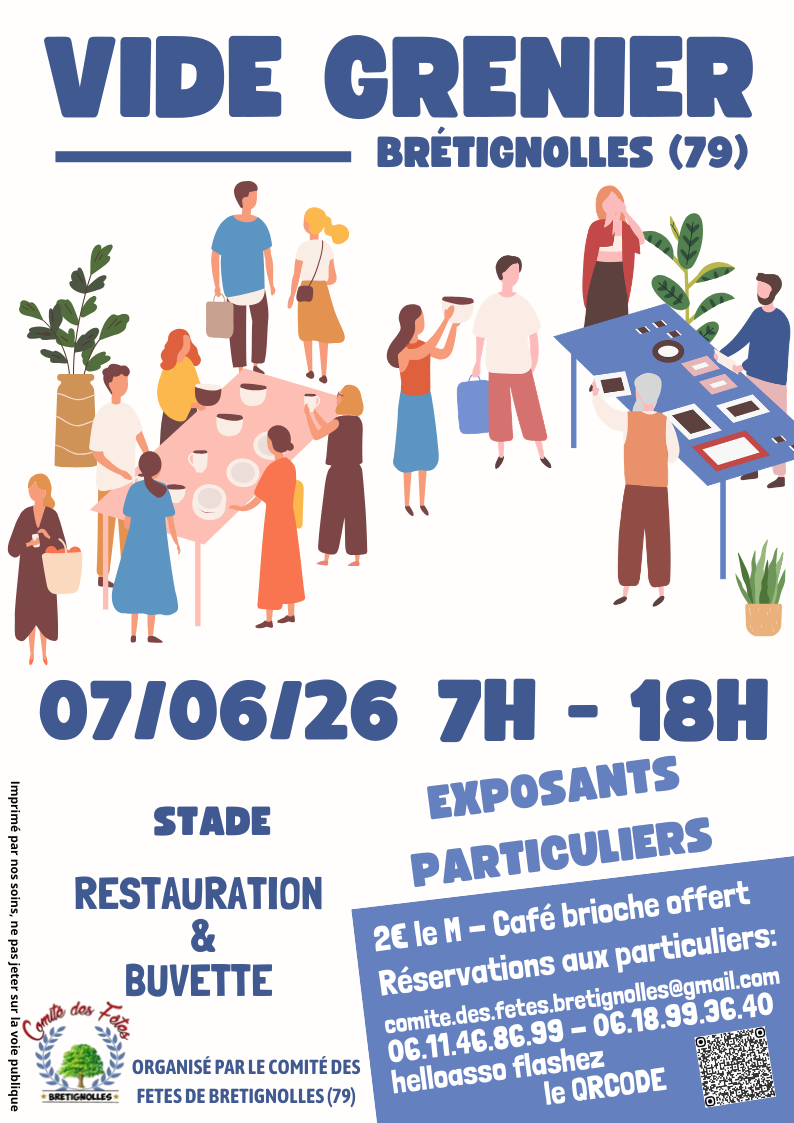 Vide Grenier réservé aux particuliers. Au stade de Bretignolles, 7h-18h 2€le Ml - Café Brioche offert aux exposants.