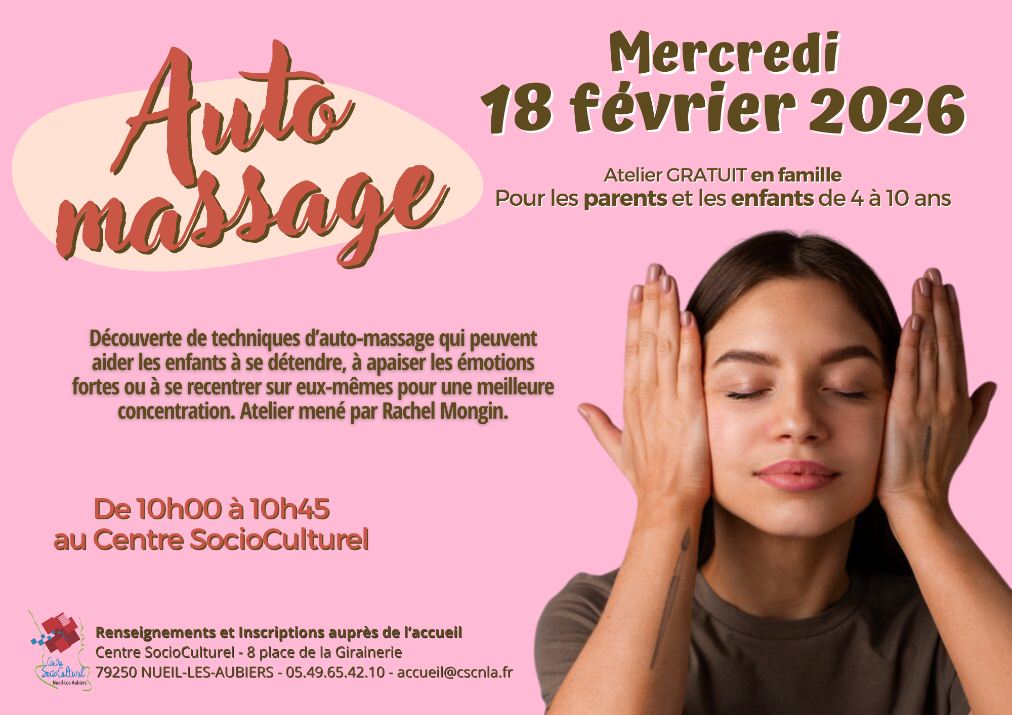 Le secteur famille du Centre SocioCulturel de Nueil-Les-Aubiers, propose, pendant les vacances d'hiver, plusieurs animations gratuites pour les adhérents au C.S.C. (10 € par foyer pour la saison 2025/2026). Quel que soit la tranche d'âge demandée pour l'animation, toute la famille est invitée, une animatrice sera présente pour les autres enfants. Rendez-vous le mercredi 18 février de 10h00 à 10h45 au C.S.C. Pour les parents et les enfants de 4 à 10 ans. Découverte de techniques d'auto-massage qui peuvent aider les enfants à se détendre, à apaiser les émotions fortes ou à se recentrer sur eux-mêmes pour une meilleure concentration.