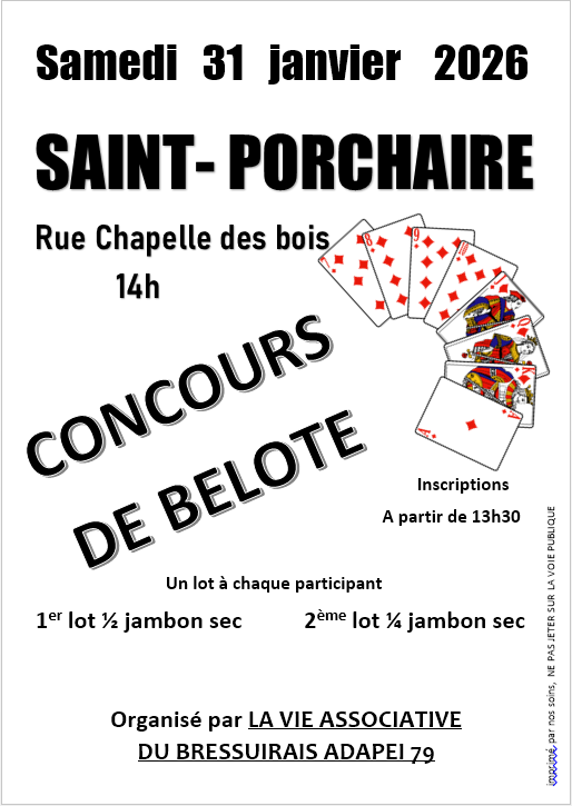 Le club de l'amitié organise un concours de belote en doublettes et pétanque en individuel, le jeudi 26 février salle du bourgneuf, à partir de 13 heures 30.