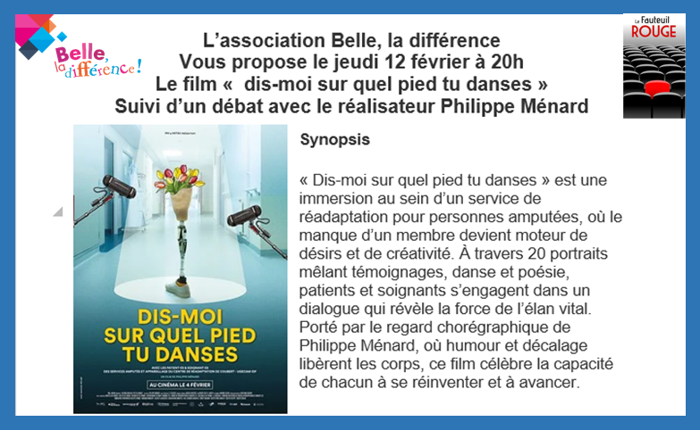 belle, la différence vous propose au cinéma le Fauteuil ROUGE à Bressuire le film "sur quel pied tu danses" suivi d'un débat avec le réalisateur Philippe Ménard le jeudi 12 février à 20h