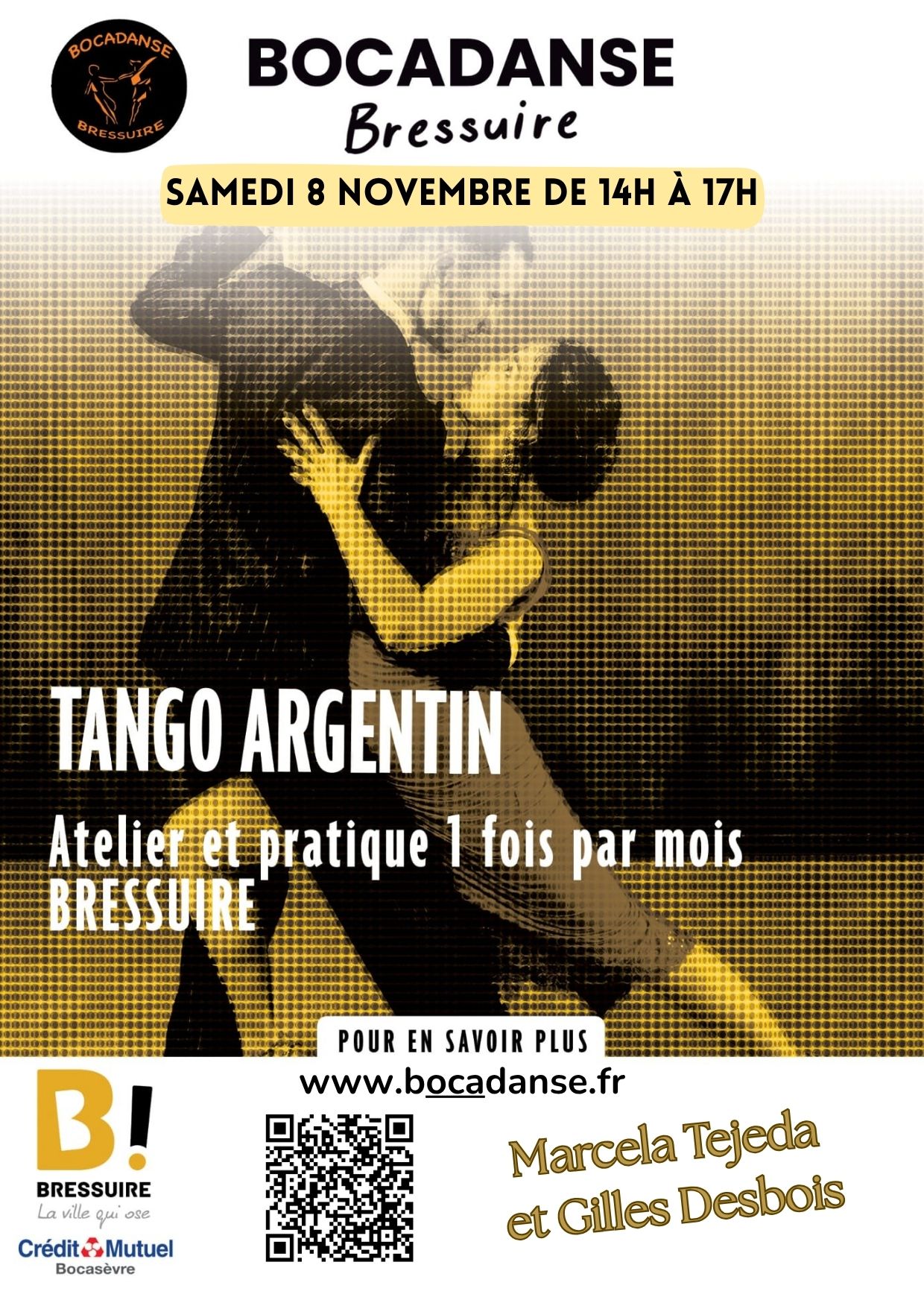 Bocadanse propose un atelier tango argentin un samedi par mois, avec Marcela Tejeda et Gilles Desbois, professeurs de l'association « Anima Tango ». Il permettra de se familiariser ou de se perfectionner avec le rythme particulier des bals tangos. Marcela et Gilles vous proposent : d’abord les bases (posture, marche, abrazo, connexion avec le partenaire), puis une figure de tango travaillée également dans le tango vals et la milonga, en l’adaptant au "Milonga".