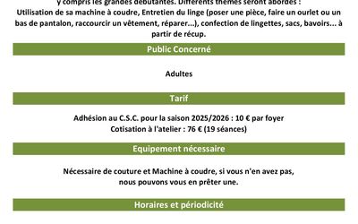 Françoise vous accompagnera dans cet atelier Couture pour tout public, y compris les grandes débutantes. Différents thèmes seront abordés : Utilisation de sa machine à coudre, Entretien du linge (poser une pièces, faire un ourlet ou un bas de pantalon, raccourcir un vêtements, réparer...), confection de lingettes, sacs, bavoirs... à partir de récup.