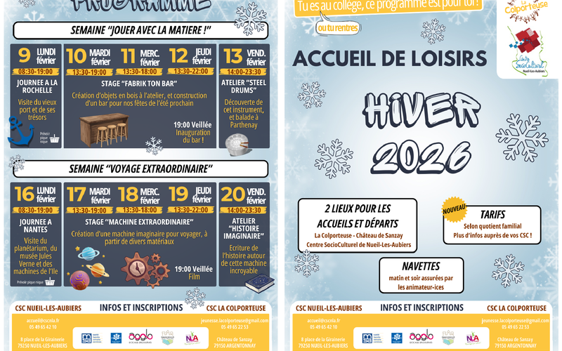 Renseignements auprès de l'accueil du C.S.C. au 05.49.65.42.10 ou accueil@cscnla.fr