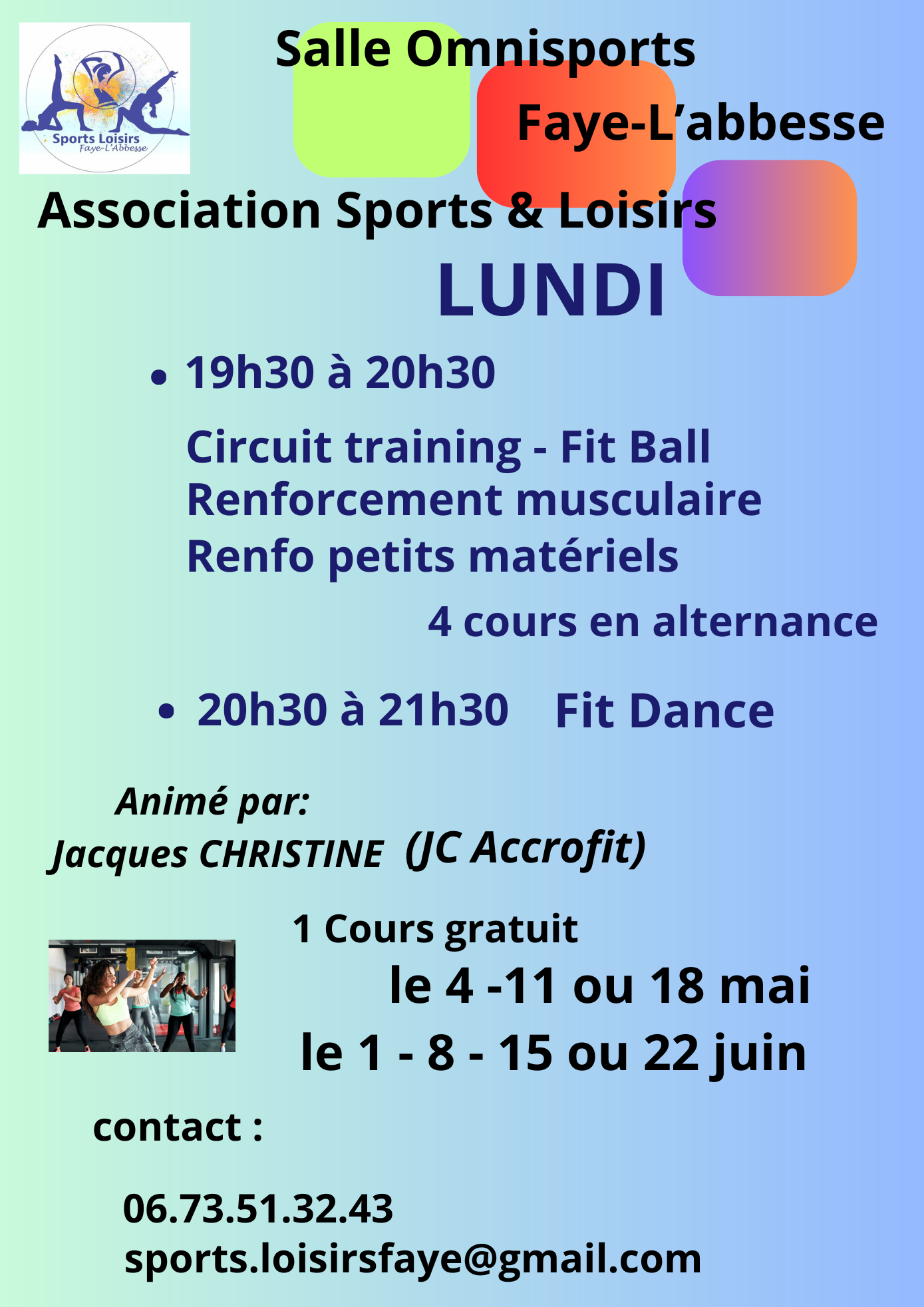 Cours gratuits à Faye-l'abbesse Salle Omnisports le lundi de 19h30 à 20h30 : 4 cours en alternances (Circuit training-Fit ball-Renfo musculaire- Renfo petits matériels) de 20h30 à 21h30 : Fit dance (réservation de préférence)